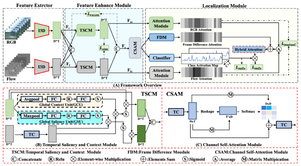 여기까지가 RGB feature를 기준으로 했을 때 TSCM의 작동 방식이고, flow feature에 대해서도 완전히 대칭적인 과정을 거쳐 F_{fe} \in \mathbb{R}^{D \times{} T}를 얻을 수 있습니다. 이후 다음 과정으로 넘어가는 최종 output은 F_{re}와 F_{fe}를 concat F_{e} \in \mathbb{R}^{2D \times{} T}입니다.