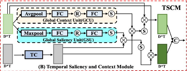 TSCM 내부의 구성 요소로 Global Context Unit(GCU)와 Global Saliency Unit(GSU)가 보입니다. GCU에는 global context를 잡기 위한 Avgpool이 존재하고, GSU에는 global saliency를 잡기 위한 Maxpool이 존재한다는 차이점이 있습니다.