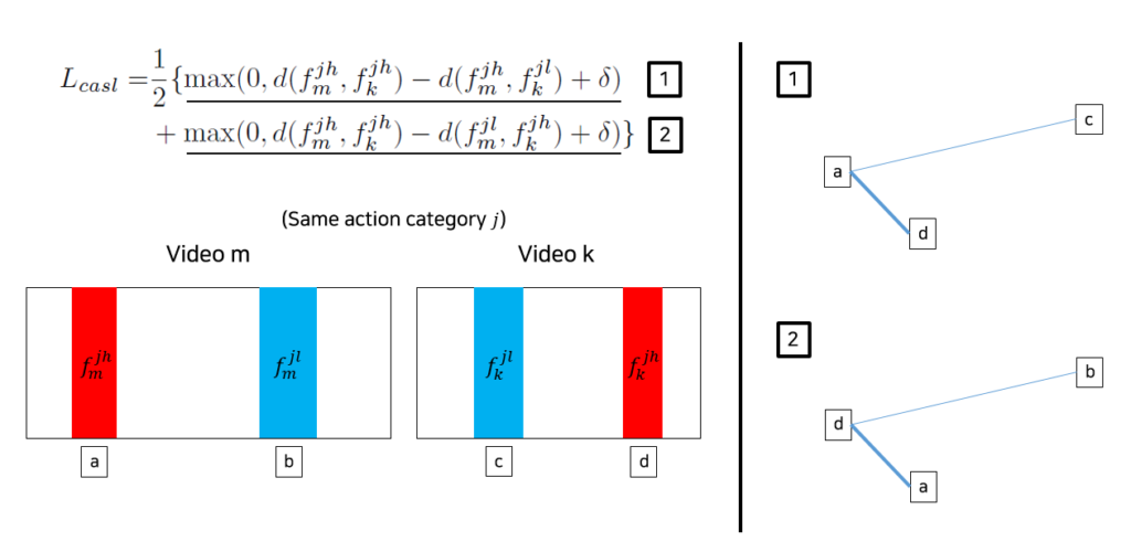 그림 7을 보시면 같은 action category j를 갖는 두 비디오 m, k에 대해 해당 action의 s^{att}가 가장 높은 clip a, d와 가장 낮은 clip b, c가 존재합니다. 수식에서의 d는 cosine sim loss로 낮아질수록 유사한 것입니다. 따라서 L_{casl}의 학습 방향은 그림 7의 오른쪽과 같이 높은 score의 clip a, d를 기준으로 상대 비디오의 낮은 clip feature와는 멀어지도록 거리를 학습하는 형태입니다.