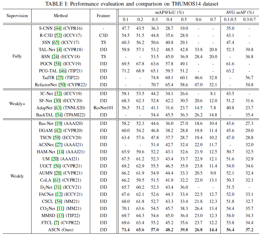 표는 THUMOS14 데이터셋에서의 벤치마크 성능입니다. 같은 ‘Weakly’ annotation 기준 다른 방법론들보다 성능이 크게 앞서고 있는 것으로 보입니다. 리포팅되지 않은 2022년도 CVPR 논문들보다도 평균 1% 이상의 mAP 향상이 있지만, 현재 arxiv에 올라와 있는 논문들보다는 조금 낮은 성능을 보이고 있습니다.