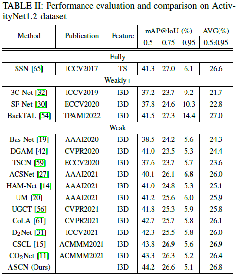 ActivityNet v1.2 데이터셋에서의 벤치마크 성능입니다. CSCL이라는 방법론이 더 높은 성능을 보여주고 있는데, 저자는 이에 대해 THUMOS14 데이터셋보다 ActivityNet 데이터셋의 비디오들이 더 길고 action의 종류가 많아 큰 성능 향상이 없었다고만 이야기하고 있습니다. 이 분석은 잘 이해가 되지 않았습니다.