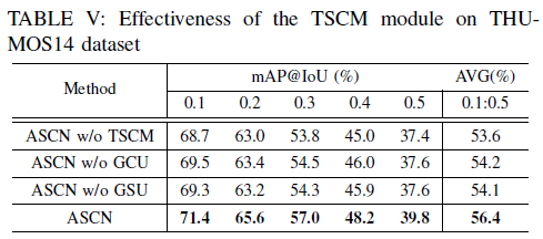 다음은 module 별 ablation 성능인데, TSCM 실험에서 살펴볼 점은 GCU와 GSU가 하나만 존재할 때보다 동시에 존재할 때 성능 향상 폭이 훨씬 크다는 것입니다. Action saliency와 context 정보가 각각 부여되었을 때 좋은 정보를 주는 것은 맞지만, 둘이 함께 사용되어야만 fine-grained한 action 구간을 찾아낼 수 있다는 점을 보여주고 있습니다.
