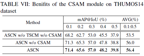 이전 방법론들 중 CO2Net의 성능이 가장 높은 것을 알 수 있습니다. 저자는 이에 대해 CO2Net에서는 Avgpooling을 통해 feature들을 합치게 되며 불필요한 정보들이 모두 포함되는데, 저자의 ASCN에서는 maxpooling을 거치는 GSU와 frame difference 계산을 통한 background suppression이 보다 효과적으로 작용했다고 주장하고 있습니다.