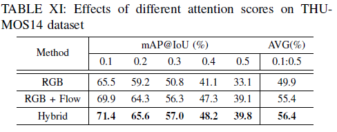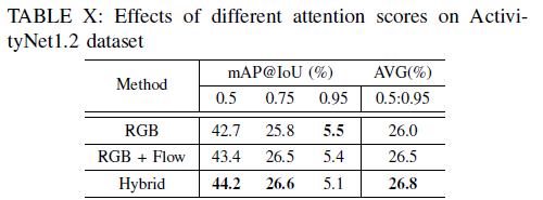 Loss 관련 ablation 실험과 Hybrid attention의 효과를 알아보기 위한 ablation 실험입니다. 마지막 표에서 RGB + Flow에 Frame Difference Attention까지 적용한 ‘Hybrid’가 가장 높은 성능을 보이고 있습니다. THUMOS14 데이터셋보다 ActivityNet 데이터셋의 비디오들이 더 길고, 많은 action class를 포함하고 있습니다. 그래서 처음 FDA 모듈을 봤을 때 너무 단순하여 길고 복잡한 비디오에서는 큰 효과가 없지 않을까 생각하였는데, 상대적으로 짧은 THUMOS14에서는 큰 성능 향상을 보여주었고 긴 ActivityNet 비디오에서는 그 효과가 덜 한 것을 실제 실험 결과를 통해 확인할 수 있었습니다.