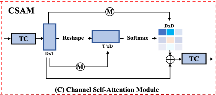 CSAM의 input은 TSCM의 최종 output인 정제된 feature F_{e}입니다. 그림과 같이 F_{e}에 TC, 즉 1D Convolution을 적용한 뒤 self-attention 연산과 유사한 과정을 거쳐 attention map A_{map}을 얻습니다. Channel self-attention 연산을 통해 모달 별 특성을 잘 살려주겠다는 것입니다.
