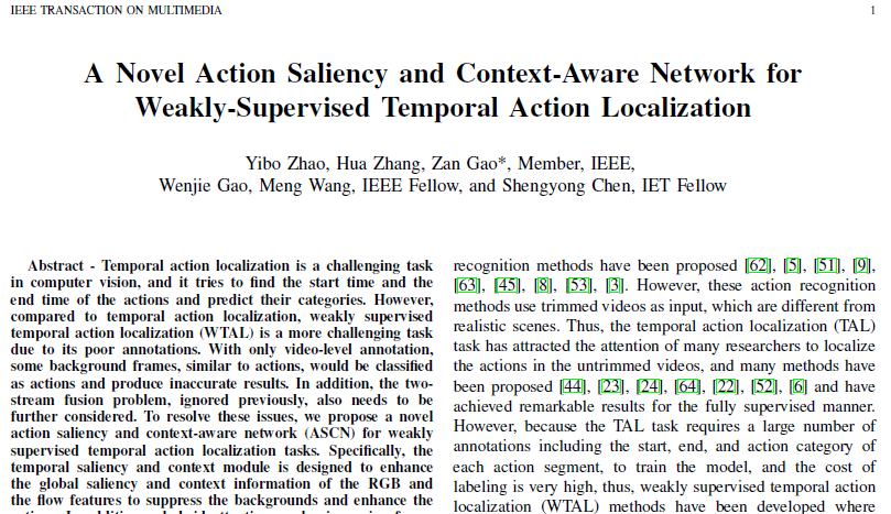 안녕하세요, 오늘 제가 X-Review에서 소개해드릴 논문은 IEEE Transactions on Multimedia 저널에 게재된 ‘A Novel Action Saliency and Context-Aware Network for Weakly-Supervised Temporal Action Localization’입니다. 올해 1월 5일날 publish 되었다고 하여 2023으로 표기하였습니다.
