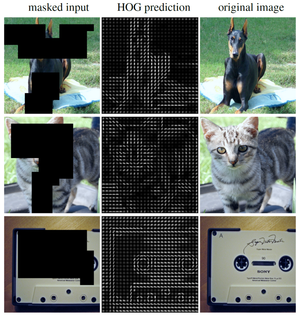 따라서 저자는 Vision 분야에서 MAE가 어떤 feature를 복원하는 것이 영상을 이해하고 더 좋은 pretrained weight으로 쓸 수 있는가에 대해 다양한 실험들을 진행하며, 결론부터 말씀드리면 그림1의 2번째 열과 같이 Histogram of Gradient(HoG) feature를 복원하는 것이 성능과 효율성 측면을 모두 고려하였을 때 가장 우수하였다고 합니다.