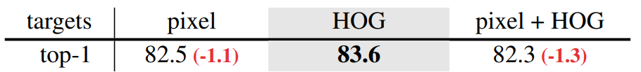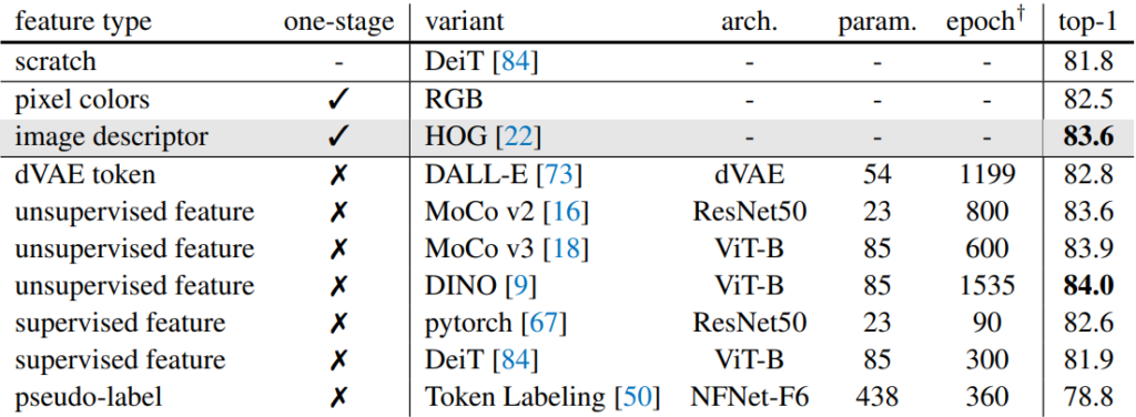 논문에서는 크게 one-stage target, two-stage target << 2가지로 타입을 나누고, 해당 타입 안에 각각 2개, 3개의 종류로 또 특징들이 나뉘게 됩니다. 먼저 one-stage target 내에는 standard MAE가 활용한 pixel color와 논문에서 최종적으로 채택한 HoG Feature로 구성이 되어있으며, two-stage target의 경우에는 사전 학습된 모델을 통해서 추출된 feature들이라고 이해하시면 되겠습니다.