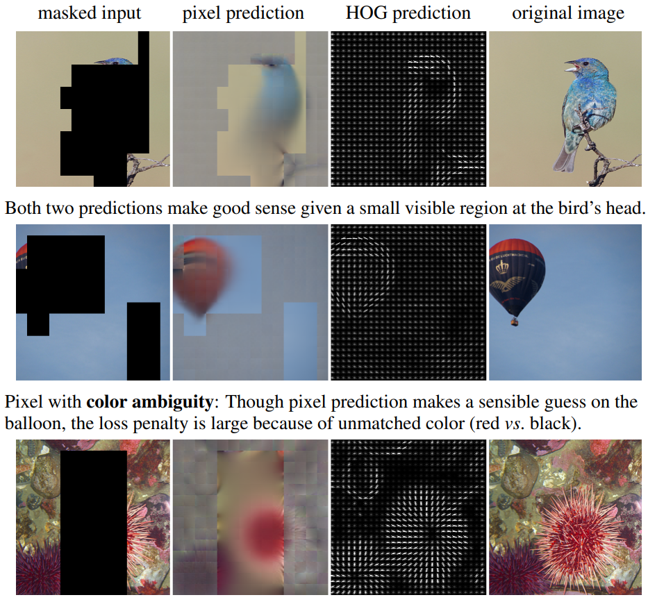 그래서 실제로 모델이 예측한 HOG Feature를 보면 열기구에 대하여 올바른 gradient 성분들을 잘 표현하고 있으며 아래 텍스쳐가 풍부한 영역에 대해서도 큰 이상 없이 자연스러운 방향성을 나타내고 있습니다. 즉 HOG prediction은 모호성에 대한 리스크를 크게 줄임으로써 더 좋은 feature representation을 할 수 있도록 도와준다고 합니다.