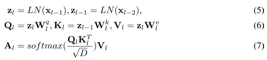 저자들은 기본적인 ViT는 각 레이어들이 독립적으로 attention map을 연산하지만, 이러한 독립적인 학습 방식은 모델의 표현 능력을 방해한다고 주장하며, 표현의 품질을 향상시키기 위해 인접한 레이어들이 상호작용하는 새로운 self-cross attention매카니즘을 제안합니다. L2LTR은 그림1의 (b)에 해당하며, l 레이어의 attention map이 \mathbf{x}_{l-1}뿐만 아니라 \mathbf{x}_{l-2}도 이용하며, 아래의 식과 같이 정의가 됩니다.