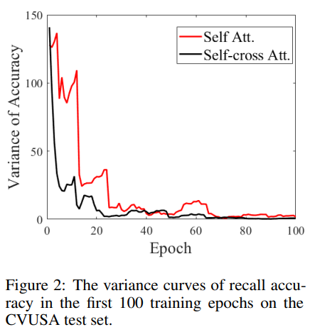 위의 그림2는 self-attention(ViT)과 self-cross attention(L2LTR)를 비교한 결과로, CVUSA 테스트 데이터(땅/공중에서 촬영한 이미지 쌍에 대한 데이터셋)에 대한 recall 정확도의 분산을 나타낸 것이라 합니다. 분산이 작을수록 리콜 정확도의 변동이 적고 학습이 안정적이라는 것을 의미한다고 합니다. 그림2를 통해 self-cross attention이 초반에는 조금 변동성이 있지만, self-attention에 비해 더욱 안정적으로 학습이 진행된다는 것을 알 수 있습니다.