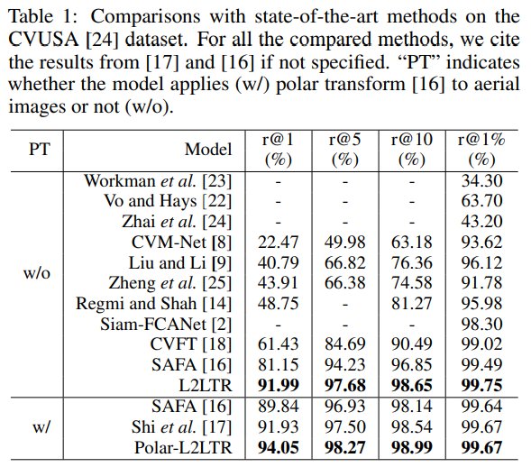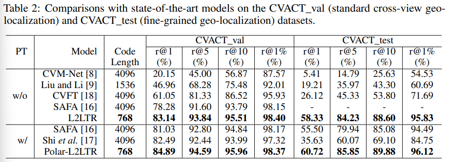 해당 논문이 크로스 모달리티를 위해 새로운 것을 제안했다기보다, Transformer가 cross-view(여기서는 땅과 공중에서 촬영된 이미지)에 적합함을 이야기하며, positional embedding을 통해 기하학적 제약을 강하게 주지 않고도 기하학적인 정보를 학습할 수 있다는 것을 보인 것으로 보입니다. 실험이 Table5에 리포팅 되어있는 “Polar-L2LTR w/o positional emb.”와 “L2LTR” 의 결과 비교를 통해서도 확인할 수 있습니다.
