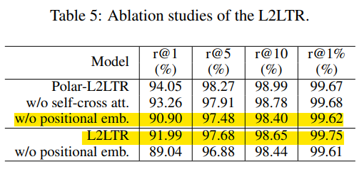 • (노란 형광팬)polar-L2LTR에 positional embedding을 적용하지 않은 결과와 L2LTR의 비교를 통해, polar transform을 positional embedding이 보완할 수 있다고 이야기합니다.