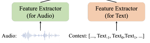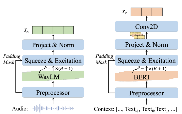 raw 오디오와 텍스트를 frame-level, token-level 임베딩으로 바꾸기 위해서 사전 학습된 모델로 WavLM과 BERT를 사용합니다. 그 다음 추출된 high-level feature는 Sqeeuze-and-Excitation (S&E) 블럭을 통과하고 이후 FC layer와 Layer Normalization을 수행합니다. 이를 통해서 두개의 모달리티를 같은 space로 맵핑합니다. 그 후에 context-aware Convolution block을 이용하여 context information을 취합니다.