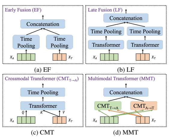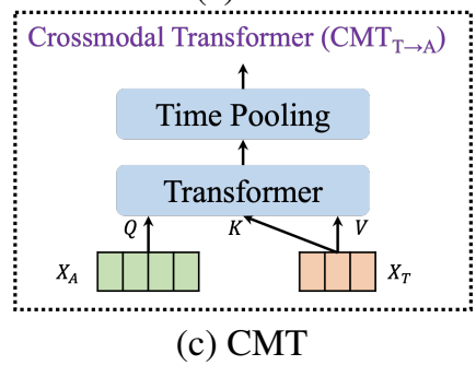 cross-modal Transformer는 하나의 모달리티가 다른 모달리티의 정보를 받을 수 있도록 하는데요. 오디오와 텍스트 모달리티를 이용하여 CMT(audio->text), CMT(text->audio)를 계산하여 융합합니다.