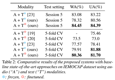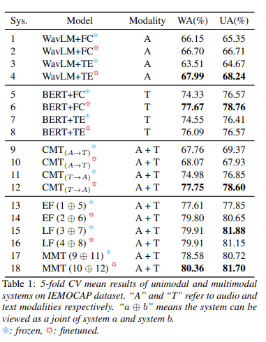 데이터셋 IEMOCAP에서 실험한 결과를 [그림 9]를 통해서 확인할 수 있습니다. 5-fold CV의 평균을 결과로 하여 성능을 측정하였다고 합니다. 여기서 A는 오디오 모달리티만, T는 텍스트 모달리티만 사용하여 성능을 측정한 것입니다. Sys에 적혀있는 것은 시스템의 번호라고 생각하시면 되는데요 13번의 EF(1+5)는 1번인 오디오 모달리티에 frozen한 WavLM+FC 모델과 5번인 텍스트 모달리티에 frozen한 WavLM+FC 모델을 Early Fussion을 통해 합쳤을 때를 의미합니다.