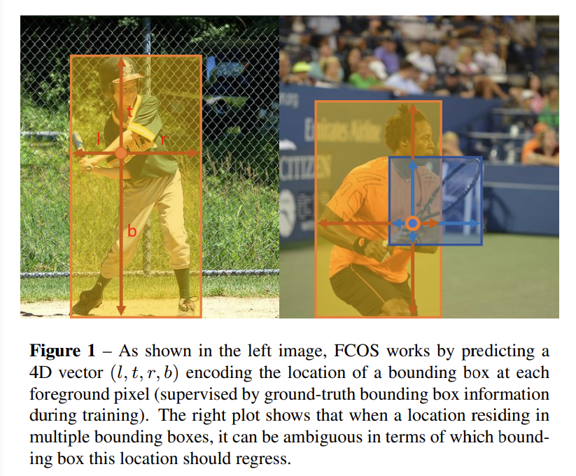 [그림 1]의 왼쪽 이미지와 같이 FCOS는 물체의 한 점을 기준으로 박스의 경계까지의 거리인 l, t, r, b를 추정합니다. 이때 [그림 1]의 오른쪽 이미지와 같이 하나의 점이 여러 물체에 속해 있는 경우가 발생할 수 있습니다. 이러한 경우, 여러개의 경계값을 추정해야 하기 때문에 논문에서는 FPN구조를 사용하여 다양한 크기의 feature를 사용하고, 그 중 각 feature map이 커버하는 최소 영역을 기준으로 하여 물체를 검출하습니다. 또한 center-ness를 통해 물체의 중심에서 멀리 떨어진 박스를 제한하는 방법을 사용하였습니다.