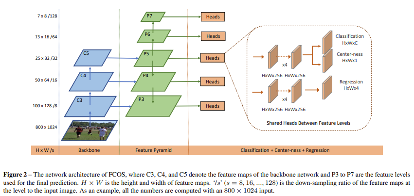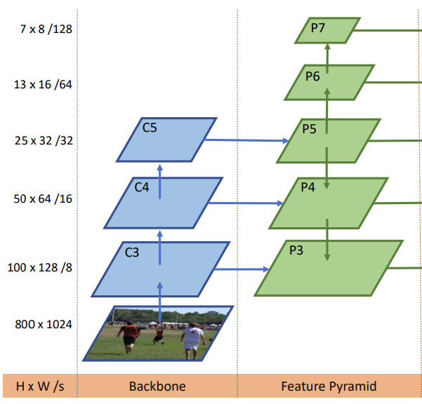 [그림 3]에서 P_3 ~ P_7은 서로 다른 크기의 feature입니다. P_3, P_4, P_5 는 각각 C_3, C_4, C_5에 1 x 1 convolution을 적용하여 얻고 P_6, P_7은 P_5에 stride 2를 차례대로 적용하여 만들었습니다. 결과적으로는 그림에서 볼 수 있듯이 P_3=8, P_4=16, P_5=32, P_6=64, P_7=128의 s를 가집니다.