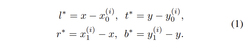 저자들은 feature map 상의 한 점 (x, y)에서 박스를 추정하는 방법으로 다음과 같은 방식을 제안하였습니다. (x, y)가 GT box에 속하면 positive sample로 간주하고, (x, y)가 GT box에 속하지 않는다면 negative sample로 간주하고 배경 클래스인 0값을 부여합니다. 이때, (x, y)에서 bounding box의 크기를 예측하는 방법은 [수식 1]과 같습니다.