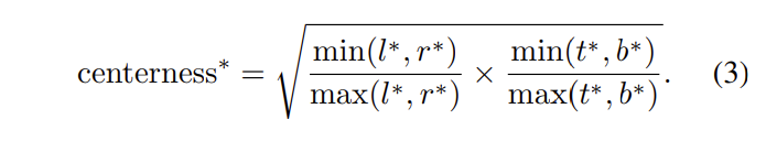 center-ness는 [식 3]과 같이 나타낼 수 있습니다. center-ness를 classification score 출력에 곱해주게 되면 마지막 layer의 NMS과정에서 중심에서 먼 박스는 걸러지게 됩니다.