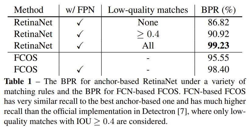 1. – table 1은 앵커 기반 RetinaNet에서 IoU에 따른 recall 변화와, 앵커 프리 방법론인 FCOS의 small recall 문제를 FPN을 사용하여 해결한 것을 보이기 위한 실험 결과입니다. 앵커 박스를 사용하지 않아 recall값을 조절할 방법이 없었는데 FPN 구조로 다양한 크기의 feature map에서 박스를 추론함으로써 Recall이 증가했다는 것을 보이고 있습니다.