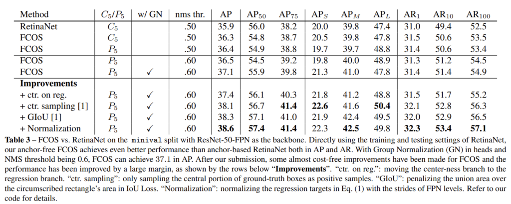3. RetinaNet에서 가장 좋은 성능을 보인다고 하셨는데 Table 1은 precision이 아닌 단순 recall을 리포팅하여 IoU, FPN에 따른 Recall 변화를 의미합니다. Table 5를 보시면 저자들이 제안한 FCOS 방법론이 가장 좋은 성능을 보이는 것을 확인할 수 있습니다.