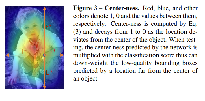 center-ness는 물체의 중심점과의 거리를 0과 1사이로 정규화하여 어떤 박스가 중심점과 가깝다면 1에 가까운 값을 배정하고, 중심정과 멀다면 0에 가까운 값을 갖도록 만듭니다.