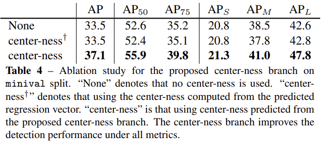 FCOS는 가능한 많은 foreground sample을 regressor의 학습에 사용하고자 하였습니다. 저자들은 anchor-based 방법론에서 충분한 IOU를 가진 sample들만 positive sample로 취급하여 학습에 사용하는 것과 달리, FCOS는 배경을 제외한 모든 샘플을 학습에 사용하였기에 더 높은 성능을 낼 수 있었다고 주장합니다.