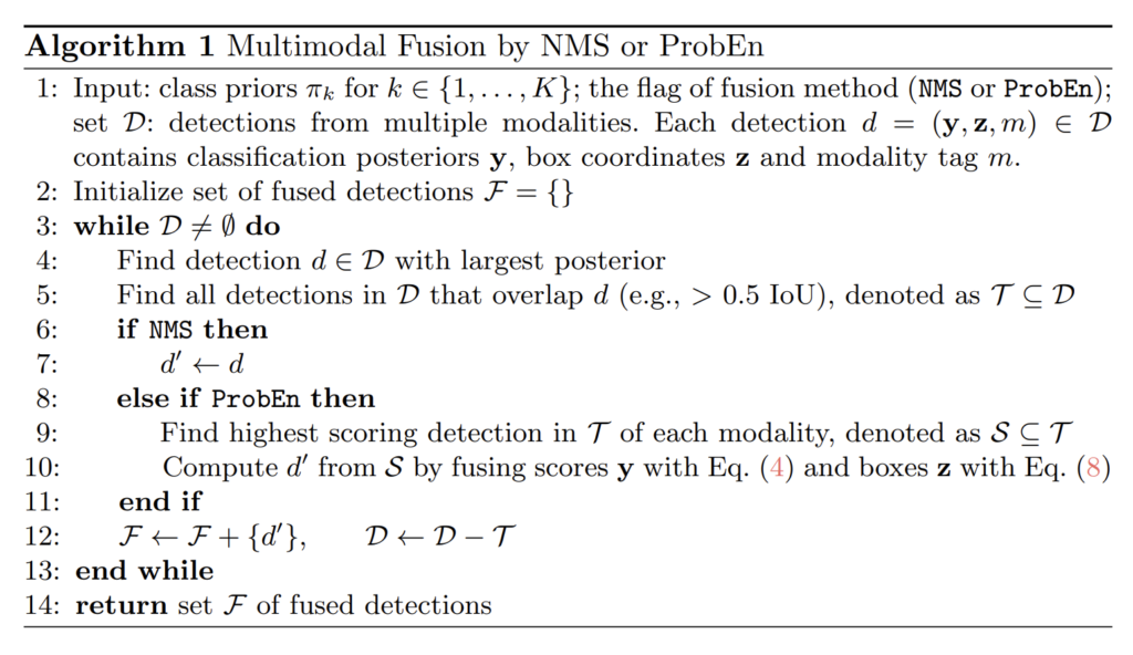+ ALG 1을 풀어서 설명하면 각 모달리티 별로 예측한 값들을 모두 담은 set D를 기반으로 NMS을 진행합니다. 가장 높은 class score를 가진 결과값대로 정렬을 진행하고 이 중 가장 높은 스코어를 가진 bbox와 IoU가 0.5 이상으로 겹치는 케이스는 제거하는 방식이 NMS에 해당합니다. ProbEn은 가장 높은 스코어를 가진 bbox와 IoU가 0.5 이상인 케이스를 제거하는 것이 아니라 모달리티 별로 클래스 스코어 퓨전 및 bbox 퓨전을 수행합니다. 해당 부분이 ProbEn이 제안한 방법입니다. 이후, 설명드리는 내용들은 모두 해당 부분에서 수행되는 연산입니다.