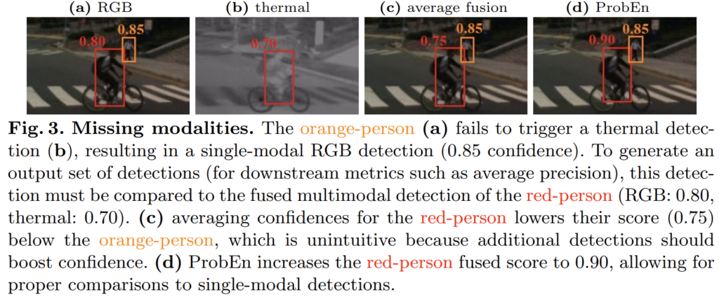 앞서 이야기한대로 NMS만을 이용할 경우, 각 모달리티의 특성을 고려한 스코어가 아닌 더 강한 모달리티의 확률을 그대로 사용합니다. 그렇기에 저자는 예측 확률 앙상블을 위해 여러가지 기법을 적용해봅니다. 대표적인 예시로 fig 3에서 보이는 바와 같이 RGB는 컨텐츠 정보가 풍부하기 때문에 제대로 찾는 방면에 Thermal에서는 낮은 화질과 적은 컨텐츠 정보로 인해 작은 크기의 사람은 잘 찾지 못하는 문제를 보입니다. 이러한 특성 때문에 두 모달리티의 특성을 함께 고려하여 찾아야만 합니다. 저자는 이를 해소하기 위해 가장 간단하게 두 스코어를 평균을 내리는 방법(fig 3-(c))을 사용합니다. 이럴 경우, 빨간 박스에서 보이는 바와 같이 한 모달리티에서 스코어가 낮을 경우 오히려 스코어가 떨어지는 문제가 있습니다. 각 모달리티의 특성(확률)을 고려하여 스코어를 융합하는 방법이 필요합니다.