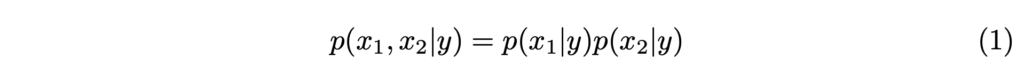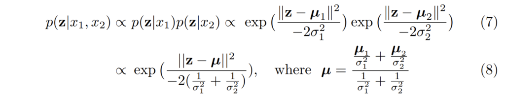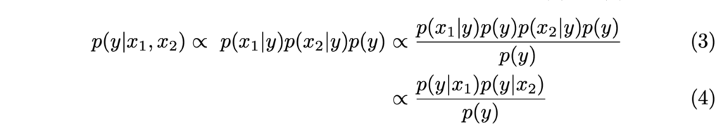 두 모달리티 x_1, x_2 의 예측 확률은 독립적이라는 전제하에서 두 모달리티는 퓨전한 확률은 각 모달리티 별 확률을 곱한 값과 동등하다는 전제를 잡고 진행됩니다.