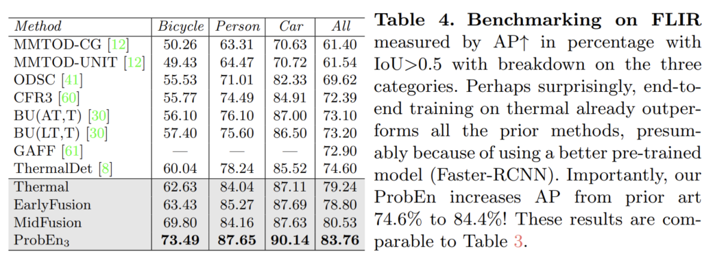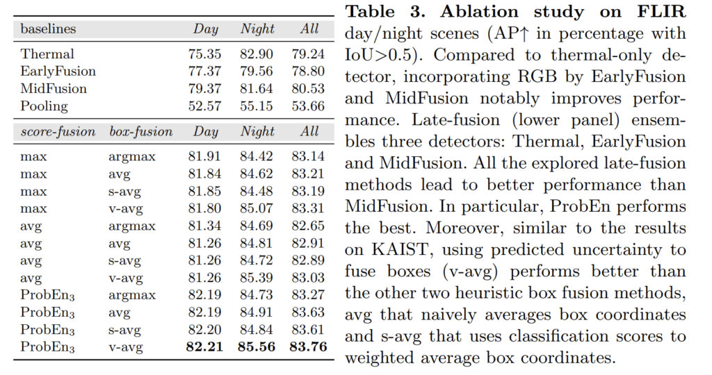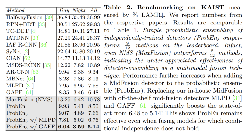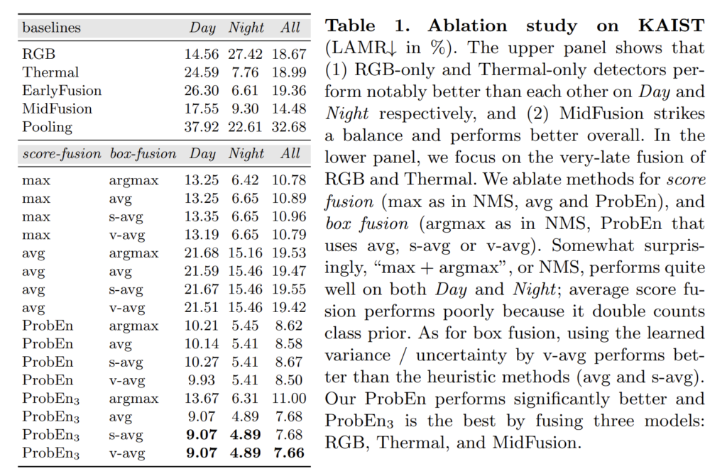 Tab 1이 정말 놀라운게 위 실험 중 ProbEn은 RGB: 18.67, Thermal:18.99 결과만을 이용하여 실험한 결과에 해당합니다. late-fusion만을 이용해서 진행한 실험만으로 최초 8.50을 찍은 것도 놀랍지만, 단순하게 max-argmax만 이용한 경우에서도 10.78 찍은 건 진짜 놀라운 결과입니다. ProbEn_3 는 MidFusion: 14.48도 함께 퓨전한 경우로 7.66으로 이미 MLPD를 넘은 성능을 보여줍니다… ㄷㄷ