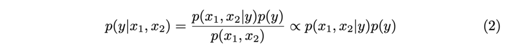 그럼 두 모달리티 x_1, x_2 를 이용하여 label y를 예측하는 모델 입장에서의 확률를 정리하면 아래의 수식 2와 같이 정리 할 수 있죠.