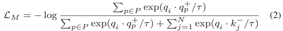 여기서는 negative만 set으로 만들어서 쓰는 것이 아니라, P라고 positive set을 함께 사용합니다. 이 셋은 augmentation된 쿼리 비디오와 함께 같은 라벨을 가진 다른 클립을 포함합니다. 예를 들어서 “펜싱” 카테고리라고 가정을 하면, 해당 비디오에 augmentation이 적용된 클립과 “펜싱” 라벨을 가진 다른 비디오들을 묶는다고 보면 됩니다.