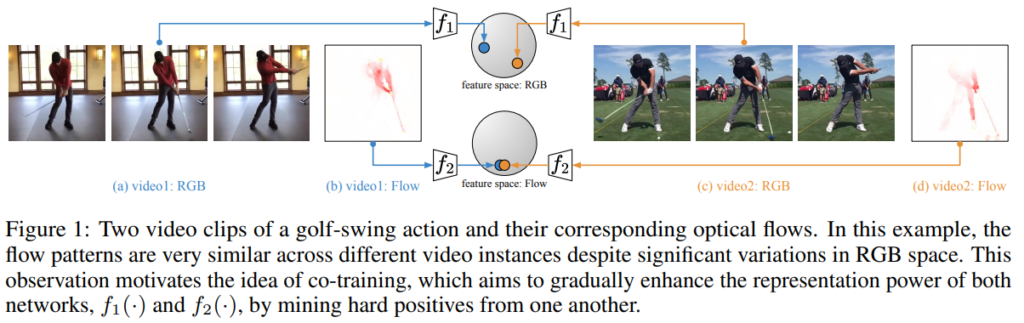 다양한 선행 연구들을 바탕으로 video representation learning에서 hard-positive example을 고르는 것. 논문에서는 mining이라고 표현을 하는데요. 이 mining이 중요하다는 것이 입증되었습니다. 그 대표적인 예시가 위의 링크를 달아둔 CoCLR인데요. CoCLR에서는 RGB에서 사용할 hard-positive를 Motion 정보를 가진 optical-flow에서 가져오고, Optical-flow에서 사용할 hard-positive를 RGB에서 가져오는 식의 학습 방법을 가지고 이 방식이 꽤 인상깊은 성능 향상을 보여주었습니다.