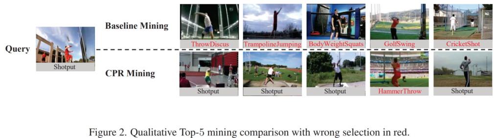 이러한 문제에 대한 예시는 [그림 2]에서 확인할 수 있는데요. 빨간색 글씨가 잘못 마이닝된 결과입니다. 베이스라인 방식이 CoCLR를 기준으로 하고 있는데요. 보면 이제 체리피킹이긴 하겠지만 대부분의 경우가 잘못 탐지된 것을 볼 수 있습니다. 이는 위에서 간단하게 설명했듯이 CoCLR의 방식에 따른 문제인데요. CoCLR가 RGB에 해당하는 hard-positive를 마이닝 할 때, optical flow에서만 보기 때문에 비슷한 액션들이 상당히 많은 데이터셋의 특성상 실제로는 다른 비디오가 선택되기 때문입니다.