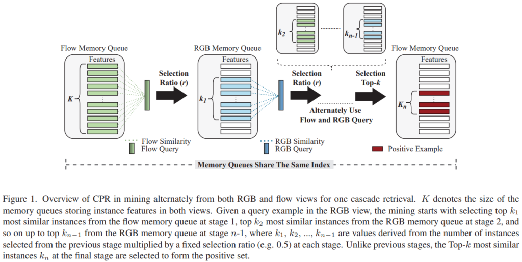 이러한 문제점들을 해결하기 위해 CPR에서는 multi-view(RGB와 Flow 모두 고려)의 장점을 도입해서 이 문제를 해결합니다. [그림 1]이 간단한 적용 예시 구조도인데요. Cascade의 뜻을 생각해보면 알 수 있는데 단계적으로 계속 걸러내는 형태의 구조를 가지고 있습니다. 먼저 Flow를 기반으로 positive sample의 후보군을 선정하면, 그 후보군에서 RGB 기반으로 한번 더 걸러냅니다. 논문에서는 이걸 스테이지라고 부르고, 스테이지 내에서는 일정 비율을 거르는 형식으로 작동하지만, 최종 스테이지에서는 top-k를 고르는 형태로 hard-positive example을 선별합니다.