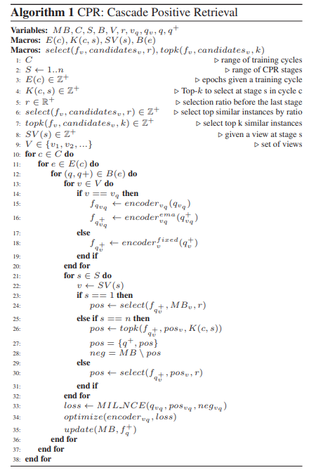 이 논문에서는 CoCLR의 mining 과정이 한번만 수행되는 것이 False positive를 선택하는 것에서 부족하다는 점에서 착안하여 Cascade Positive Retrieval (CPR)을 제안하고, positive example mining 시스템 자체를 분석한 내용을 담고있습니다. 논문에서 제안하는 CPR은 이름에서 볼 수 있듯이 서로 다른 뷰에서 cascade stage를 거쳐서 positive example을 refine해가며 마이닝 하는 모듈인데요. 기존의 CoCLR가 반대되는 모달리티에서만 고려했다면, 이 방법론은 나의 현재 모달리티도 고려하는 방식이라고 보면 좋을 것 같습니다. 사실 Workshop논문이라 Contribution이 그렇게 많지는 않고 모듈 하나를 잘 제안했다 정도인데요. 그래도 요약을 해보면 아래와 같습니다.