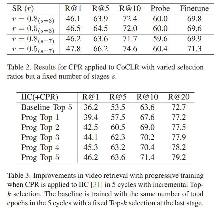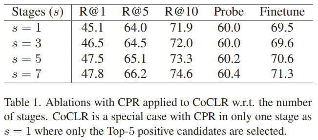 [표 1]은 스테이지의 갯수에 따른 성능 차이입니다. 스테이지가 깊어질수록 성능이 오르는 것을 볼 수 있는데요. 일단 학습 과정에서 100epoch의 학습을 고정했기 때문에 학습 시간에 따른 수렴 차이의 문제는 아닙니다. 이를 고려해보면 Refinement의 관점에서 positive sample의 정확도가 높아지기 때문에 성능이 오른다. 즉, 실제로 CoCLR가 한쪽 모달리티만 고려하는 것이 문제가 맞다는 것을 보여줍니다.