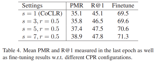 workshop 논문이라 분석하시는 부분과 같이 설명 없이 넘어가는 애매한 부분이 있는 것 같습니다. 표 7과 같이 CoCLR 성능 자체를 숨기는 부분도 있는 것 같고요. 제가 판단해보면, 표7에서도 RGB+CPR 성능이 없는 것을 보아, RGB로 inference할 때 CPR이 방해하는 요소가 존재하는 것 같습니다.