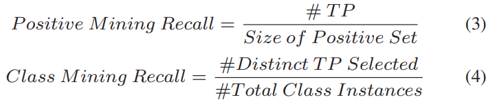 [수식 3]과 [수식 4]를 이용한 PMR(positive mining recall)과 CMR(class mining recall)을 새로운 메트릭으로 사용합니다. PMR은 선택된 positive set에서 최종적으로 선택된 top-k에서 TP의 비율을 측정하는 것이고, CMR은 1에포크에서 클래스끼리 구별이 된 TP의 비율을 의미합니다. 이러한 상황에서도 함께 비교를 해봐도 CPR을 적용했을 때 모든 지표에서 향상을 보이는 것을 확인할 수 있습니다.