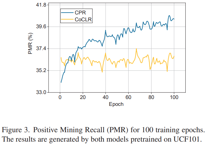 [표 4]는 얼마나 positive sample을 잘 골랐는지에 대한 정량적인 지표를 계산한 결과인데요. CoCLR는 R@1에 대한 수치만 제시하여 비교하고 있습니다. 하지만 이 수치가 실질적으로 얼마나 많은 True positive를 가지는지 불분명하기 때문에 새로운 지표로 비교를 하고 있는데요.