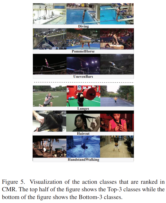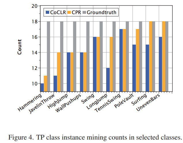 CoCLR와 CPR이 적용된 CoCLR의 비교 실험을 더 자세하게 보면 [그림 3]과 [그림 4]를 통해 볼 수 있는데요. CoCLR대비 CPR의 PMR이 학습을 거치면서 확실하게 개선(마이닝 과정의 정확도 개선)되는 것을 볼 수 있고, 클래스 별로 봐도 일부 클래스를 제외하면 더 골고루 선택하는 것을 볼 수 있습니다. 더 골고루 선택한다는 뜻은 비슷한 모션 정보를 가지고 있는 액션들 끼리도 충분한 구분력을 가지고 잘 구분했다는 뜻입니다.