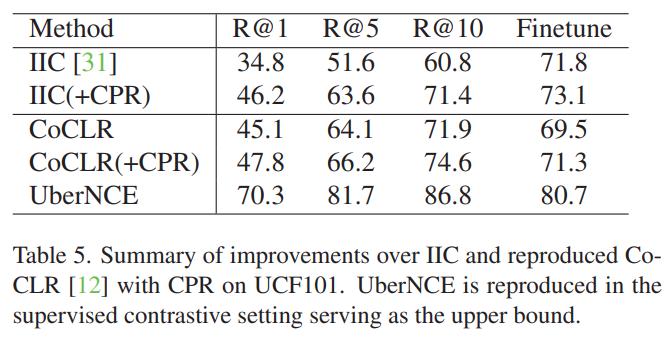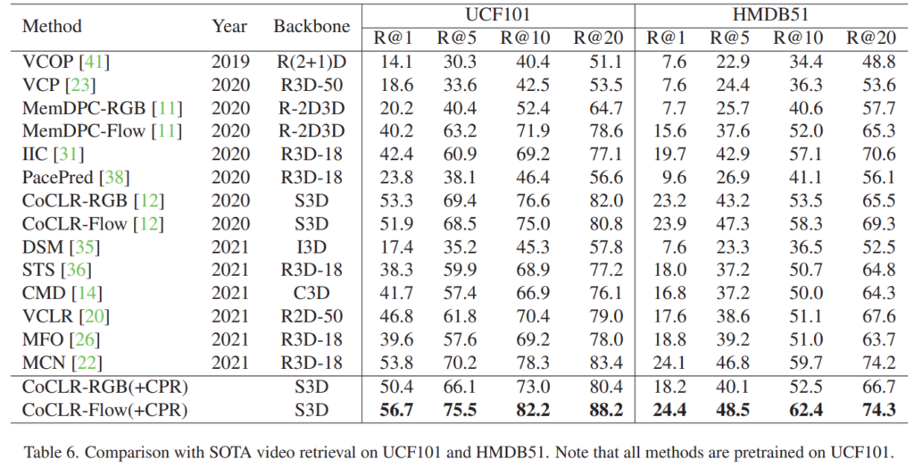 그래서 다른 방법론들과 retrieval에서 비교를 해보면 [표 6]과 같은데요. CoCLR방법론이 원래 성능이 꽤 좋은 방법론에 속하는데요. CPR을 적용하면 새로운 SOTA를 달성할 수 있음을 확인할 수 있습니다. 이는 특히 검색의 관점에서는 fine-tuning이 따로 필요한 것은 아니라서, 이러한 성능 향상이 결국은 CoCLR와 동일한 결론 “positive example을 잘 고르는 것이 중요하다”는 것을 보여줍니다.
