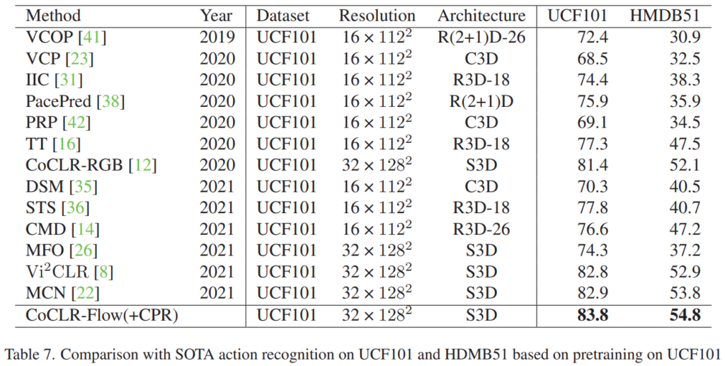 [표 7]은 video classification에서의 성능 비교인데요. 역시 CPR을 적용한 방법이 제일 좋은 성능을 보이는 것을 보이는 것 처럼 보이지만, 사실 CoCLR 성능 자체가 RGB / FLOW 성능이 각각 81.4% / 83.5%입니다. 새로운 SOTA를 달성한 것 처럼 보이지만 원래 성능이 좋았다는 것인데요. 이 논문에서는 아마 이런 문제를 좀 숨기고자 표기를 안한건가… 싶기는 하네요.