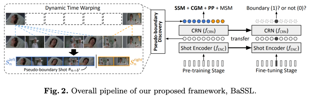 Pre-train 단계에서 input window S_{n}이 주어지면 BaSSL은 shot 끼리 semantic transition이 최대로 변하는 지점을 탐색하고 그 부분을 pseudo boundary로 지정합니다. 그리고 이 boundary를 이용하여 여러가지 self-supervised pretext task를 수행하죠.