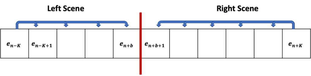 e_{n+b}와 e_{n+b+1}을 기준으로 두개의 sequence가 생성 됩니다. 수식을 보면 Left Scene 내에서 가장 왼쪽에 있는 shot인 e_{n-K}와 나머지 shot 들끼리의 유사도를 모두 더해 평균 내주고 있습니다. Right Scene 역시 마찬가지로 계산하고 있습니다.