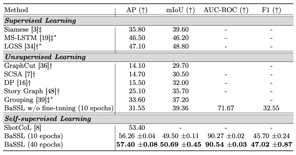 아직 Video Scene Segmentation 연구가 활발하게 이루어지고 있지 않아 Benchmarking에 들어가는 방법론이 많지는 않네요.