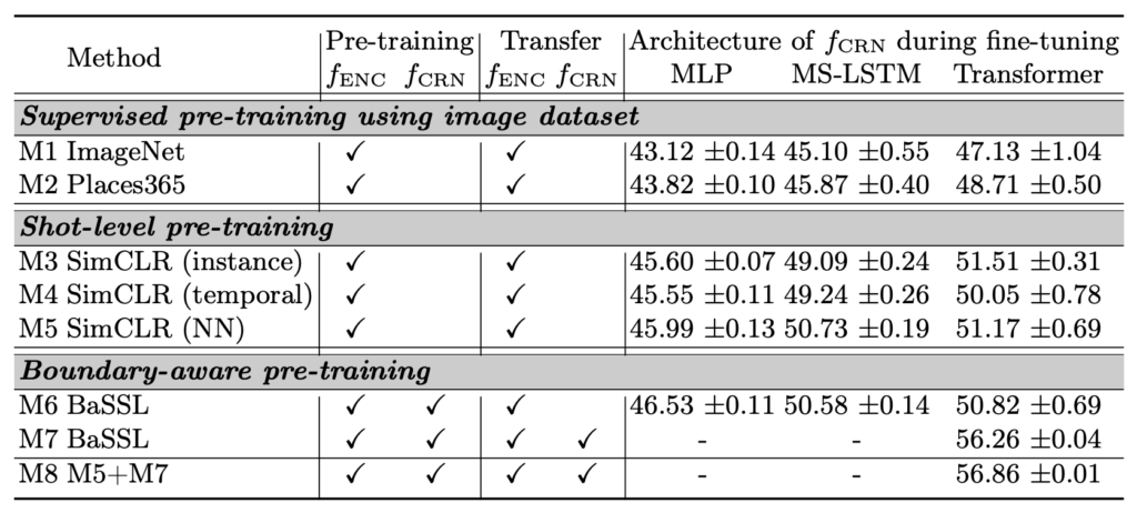 Supervised pre-training using image dataset은 image classification task를 바탕으로 사전학습을 진행하는 것이고 Shot-level pre-training은 ShotCoL에서 제안하는 방식 그대로를 사용한 경우 입니다. 마지막으로 Boundart-aware pre-training은 저자가 제안하는 방식으로 pre-training을 진행했을 때의 성능입니다.