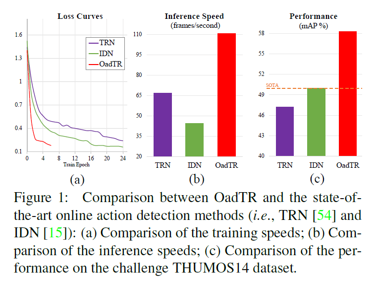 본 논문에서 OAD에 최초로 Transformer를 적용하였기에 방법론의 이름은 OadTR입니다. 그림 1은 RNN을 활용하여 OAD task를 수행하는 기존 SOTA 방법론인 TRN, IDN과 OadTR의 학습 추이, inference speed, 성능 비교 표입니다. 상대적으로 적은 epoch 내에 수렴하며 성능도 월등히 높고, inference 속도도 압도적인 것을 볼 수 있네요.
